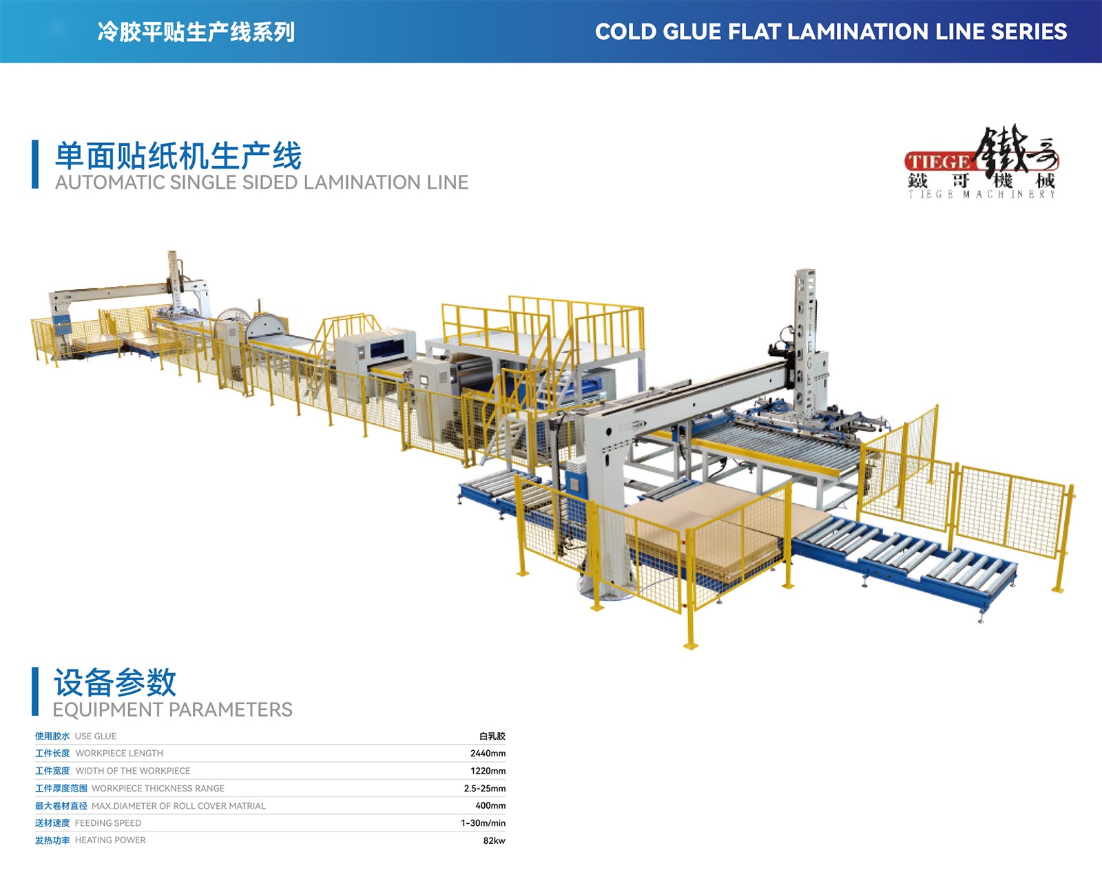 简便,性能稳定等优点;加工后的板材表面不起皱,不起泡,产品合格率。除了单面贴纸,此生产线还可设计同时双面贴纸,达到高速产