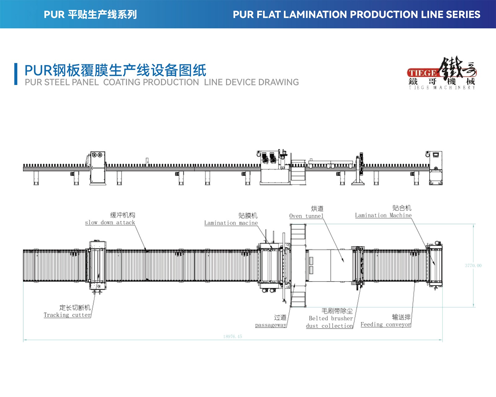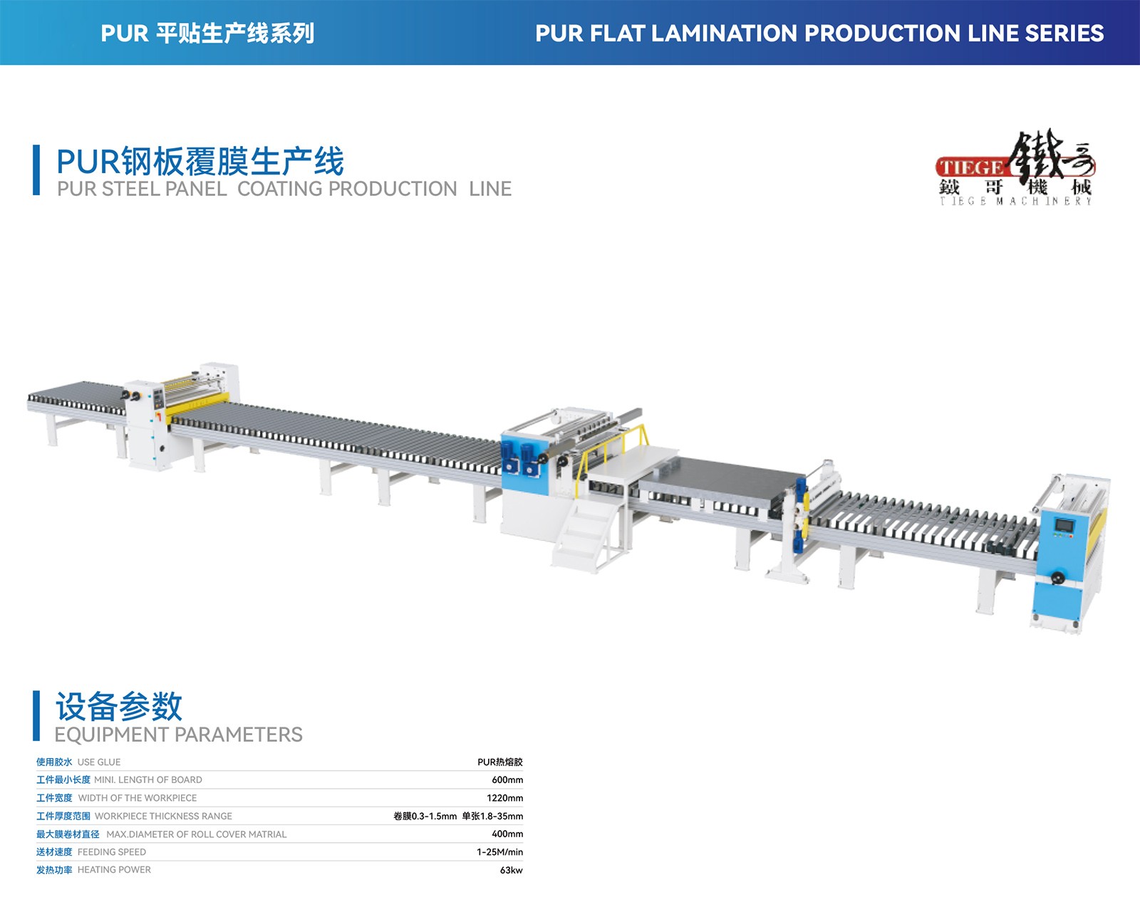 PUR平贴设备使用PUR热熔胶对各种板材与各种面材进行覆合;基础的生产线包含:除尘、烘道预热、三辊涂胶、贴合、修磨边等功能;