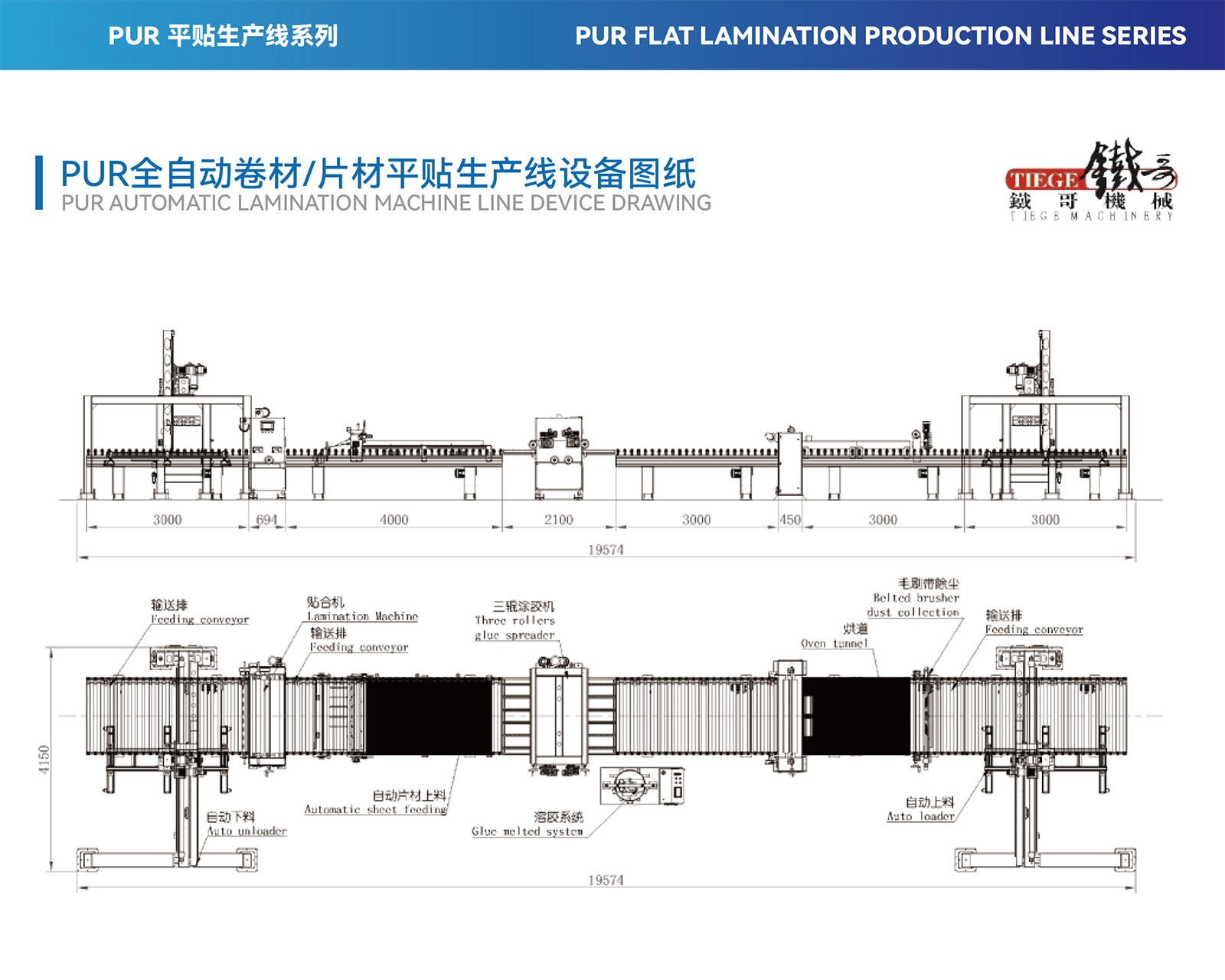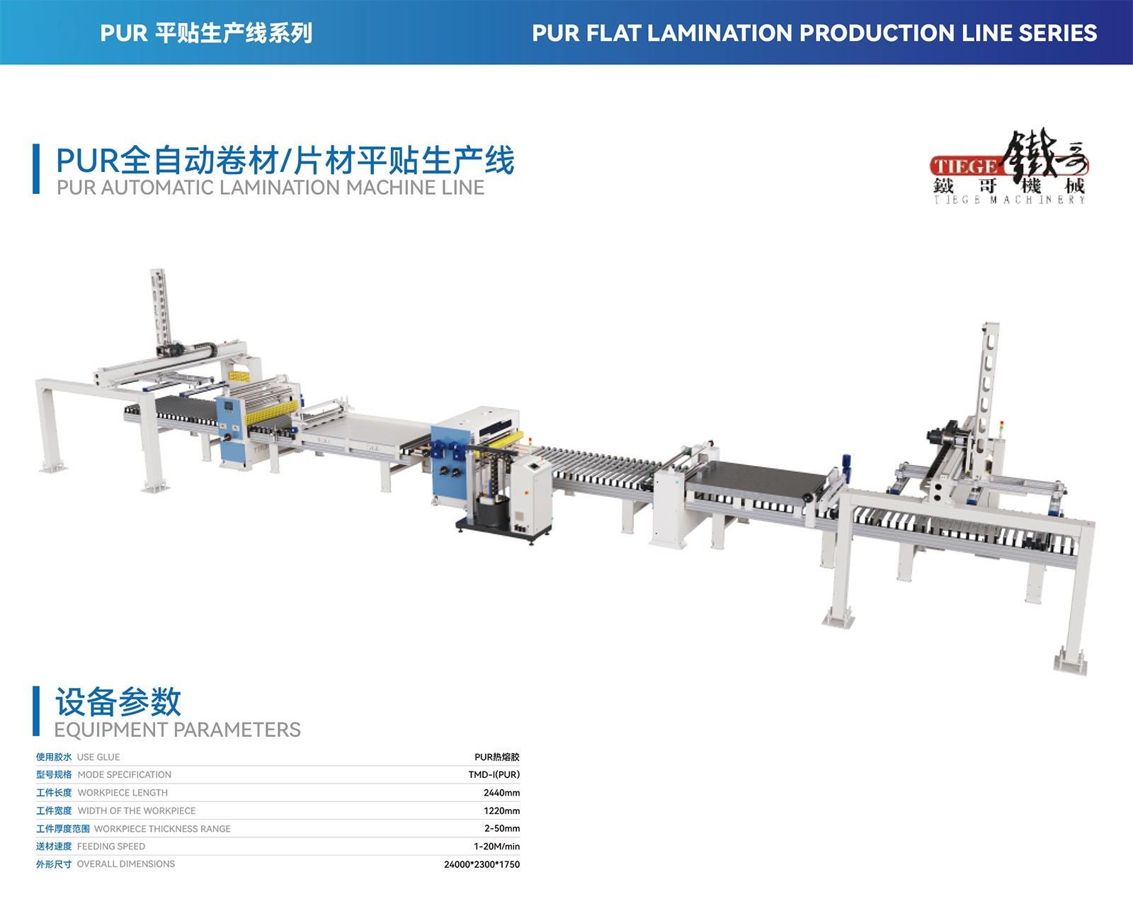 PUR平贴设备使用PUR热熔胶对各种板材与各种面材进行覆合;基础的生产线包含:除尘、烘道预热、三辊涂胶、贴合、修磨边等功能;
